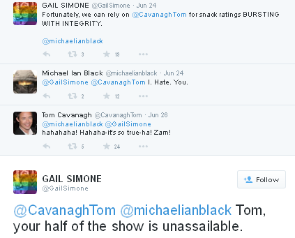 Can we talk about the fact Gail Simone is a Matey? And has been bickering on and off with Michael about him playing fast and loose with ratings (Michael: “I PLAY IT STRAIGHT!!!!)? And that Tom Cavanagh has an English degree?