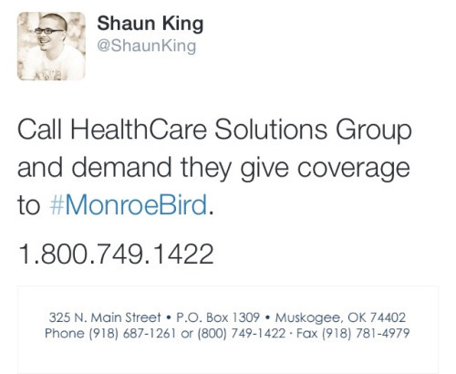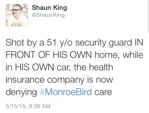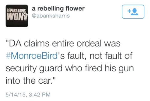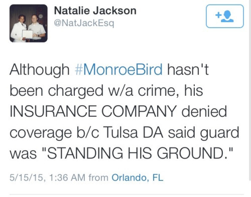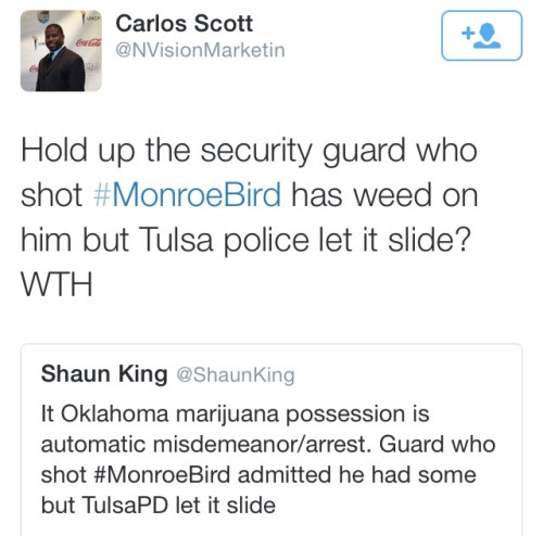 The security guard who shot Bird possessed marijuana at the time of the shooting. He told the Tulsa police that he hadn’t smoked it in a few weeks, and they didn’t even give him a citation. This is the definition of white privilege. Mind you, Tulsa was quick to test Eric Harris for drugs after they killed him and then released the results widely—even though he never acted violently toward officers.The security guard went to the tired, age-old excuse and claimed that he saw Bird reach into his glove compartment. According to the police report, no weapons were found in or near the car, and no items that even seemed to belong in the glove compartment were found out or about in the car.The security guard claimed he thought Monroe and his female passenger were having sex in the car and that he only approached them because of this. She’s white. Bird is black. Both denied doing anything of the sort.