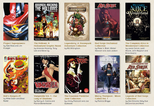 Project Superpowers by Alex Ross and Jim KruegerBob’s Burgers #1 by Mike Olsen and Brad RaderThe Hollows: A Hollowland Graphic Novel by Amanda Hocking, Tony Lee and Steve UyLegenderry: A Steampunk Adventure Collection by Bill WillinghamLegends of Red Sonja Collection by Gail Simone, Kelly Sue DeConnick and MoreMercy Thompson - Moon Called Vol. 1 by Patricia BriggsRed Sonja Unchained Collection by Peter V. Brett, Walter Geovani and Jack JadsonThe Complete Alice in Wonderland Collection by Lewis Carroll, Leah Moore, John Reppion and Erica AwanoThe Essential Painkiller Jane Collection by Jimmy Palmiotti and Joe QuesadaVampirella Vol. 1 - Our Lady of Shadows by Nancy A. Collins and Patrick BerkenkotterLote adicional: