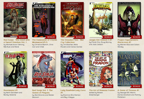 A Game of Thrones #1 by George R.R. Martin, Daniel Abraham and Tommy PattersonJungle Girl Season 3 #1 by Frank Cho, Doug Murray and Jack JadsonLady Rawhide/Lady Zorro #1 by Shannon Eric Denton and Rey VillegasProject Superpowers: Blackcross #1 by Warren Ellis and Colton WorleyReanimator #1 by Keith Davidsen and Randy ValienteRed Sonja Vol. 1: The Queen of Plagues by Gail Simone and Walter GeovaniRed Sonja - She-Devil with a Sword Omnibus Vol. 1 by Michael Avon Oeming, Mel Rubi and MoreThe Art of Ramona Fradon by Robert GreenbergerThe Damnation of Charlie Wormwood #1-5 by Christina Blanch, Chris Carr and CheeThe Dresden Files - War Cry Collection by Jim Butcher, Mark Powers and Carlos Gomez