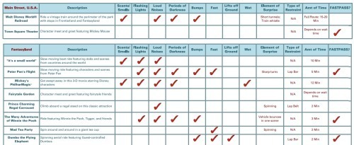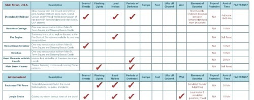 Disneyland and Walt Disney World now have guidebooks for guests with cognitive disabilities (such as autism). They include the above charts of what to expect at each attraction (strong smells, loud noises, restraint types used, duration, and more), lists of quiet areas for when you need down time, and answers to frequently asked questions, among other tips.