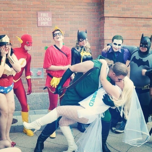 Still the greatest #cosplay picture of all time! #GreenArrow #BlackCanary #WeddingSpecial #WonderWoman #Flash #Batgirl #Speedy #Joker #Batman #DC #BostonComicCon