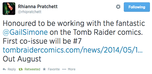 Rhianna Pratchett: "Honoured to be working with the fantastic @GailSimone on Tomb Raider comics. First co-issue will be #7..."
