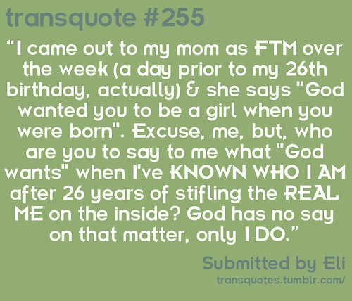 I came out to my mom as FTM over the week (a day prior to my 26th birthday, actually) & she says “God wanted you to be a girl when you were born”. Excuse, me, but, who are you to say to me what “God wants” when I’ve KNOWN WHO I AM after 26 years of stifling the REAL ME on the inside? God has no say on that matter, only I DO. Submitted by Eli