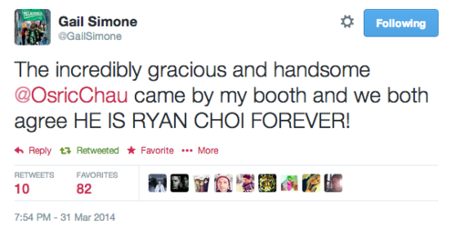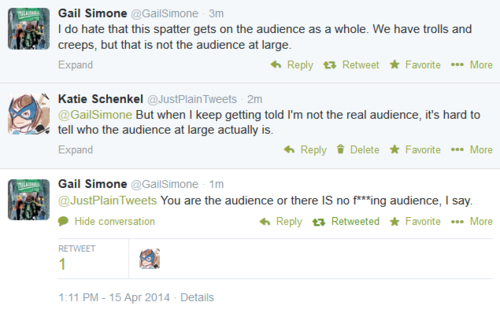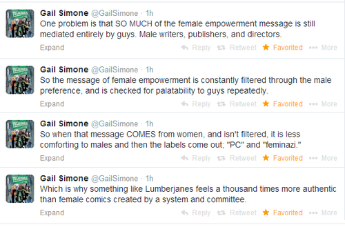 i was wondering if you could maybe elaborate on your comment about gail simone? i'm not really sure what you meant--that she's made nothing of merit, or that lumberjanes isn't merit-worthy? i mean...i love gail simone's writing for the batgirl comics, and
