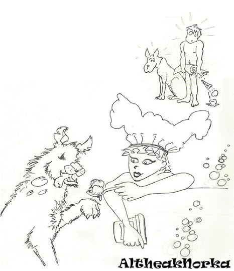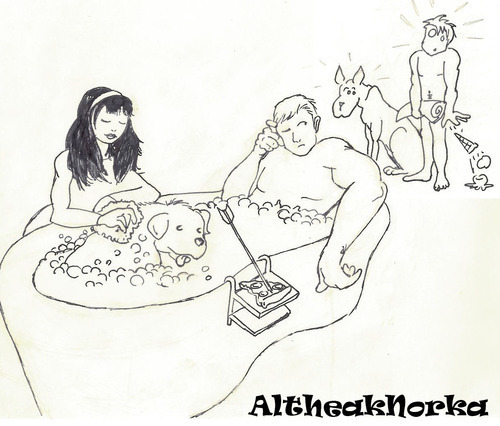 Gail Simone, in response to the Harley Quinn bathtub art contest, asked for Nightwing in a bathtub eating gelato with Ace. I’m afraid things didn’t go according to plan. Enjoy!