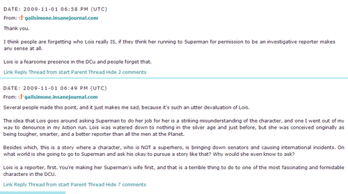 I found this thread of comments from Gail Simone on scans (I hope it’s really her) and I just loved the comments on Lois Lane in BoP 101/2