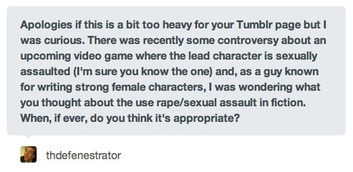 I’m not entirely up-to-speed on all the current video game releases and news, but I’m assuming you’re referring to the new Tomb Raider game that Square Enix is releasing, made by Crystal Dynamics. I’m also not up-to-speed on everything that’s been said about it, so my information is based more on heresay than anything else, but my understanding is that there’s certainly an active threat of sexual assault against Lara in the new game, though whether or not she is raped, I don’t know.