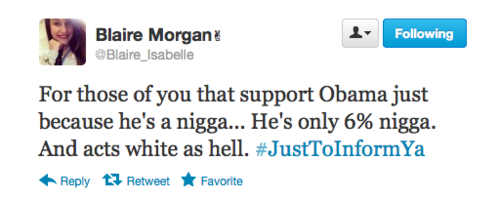 I went to go look at these women’s twitter accounts and they’re both completely unrepentant. To them, they live in that happy twilight where saying racist shit somehow is just ‘keepin’ it real,’ and not, you know, being ignorant scumbags.
