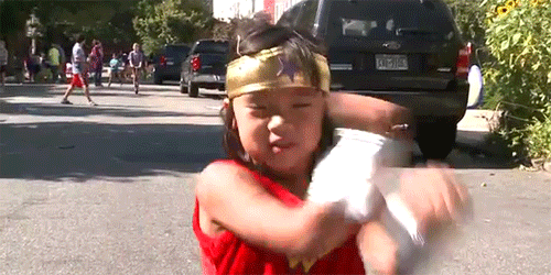 [Image Description:Two gifs of an adorable young Asian girl dressed up as Wonder Woman. She is standing in what appears to be a street witha black car behind her.]