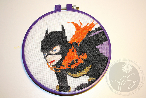 After stitching Deadpool and Hellboy, I decided I needed to stitch some more DC. More so, after seeing The Dark Knight Rises. At first I was all BANE! Then I decided I needed some female representation, and was torn between Big Barda and Scandal Savage. Then I dug out this purple frame and realized it just HAD to be Batgirl. I picked Babs.