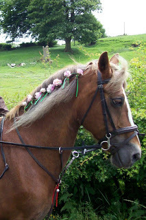 My mare Boushka adorned on Midsummer's Day, 2009. My equine muse makes a cameo appearance in my new novel, DAUGHTERS OF THE WITCHING HILL, as Alice Nutter's horse.