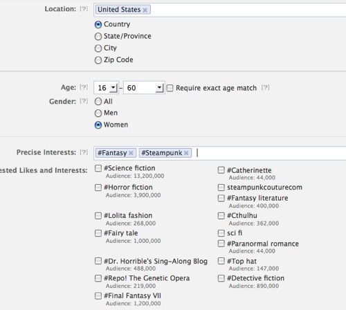 One thing I like about Facebook advertising over, say, Google Adwords, is that you can target a very precise viewership. Thanks to the “like” system, and many other factors, Facebook knows a ton about its users. Let’s say you’re a science fiction author. It’s possible to only display your ads to men between the ages of 18 and 29 who are fans of Star Wars, Battlestar Galactica, or Orson Scott Card. This serves to keep costs down (no drive-by clicks from parties who aren’t likely to be interested in your work) while potentially connecting you with your ideal audience.
