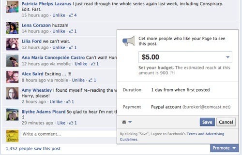 Though that might make sense, the downside is that a “like” doesn’t get you much as an author. As I write this post, I have 1200-odd likes, and I’d say that maybe 100 people interact with my fan page regularly (leaving comments or likes on my posts). Advertising a specific post (maybe one that lets people know you have a new book out or offers a coupon/free-download on an existing book) is a way to bring back those folks who were interested enough to like your site once but haven’t been back in a while.