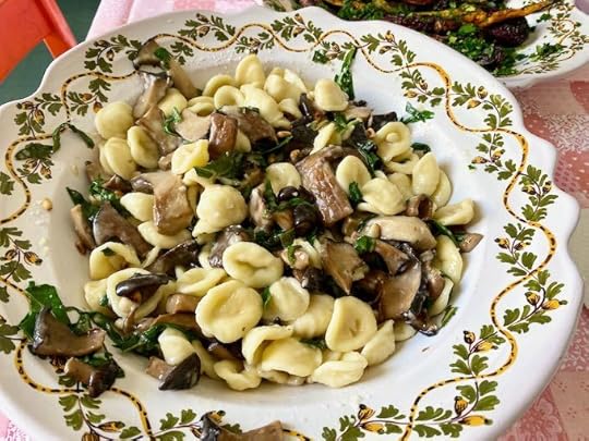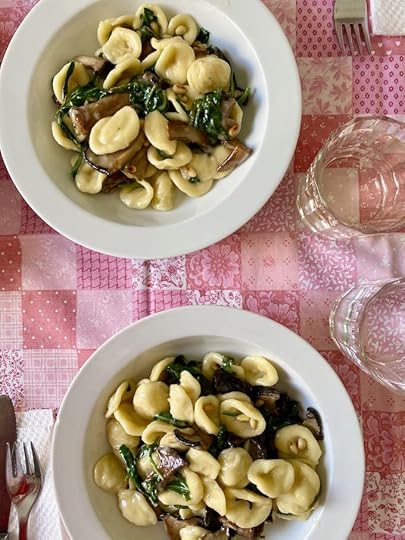 I made this mushroom and pine nut pasta during the first real trip we made after our lockdown ended. Our first road trip was to drive to Puglia to see Domenico’s mother. We hadn’t seen her since Christmas! She weathered the lockdown just fine since, basically, she’s been on lockdown for the past 2 years. Since she is not that mobile anymore (she’s 98!) the farthest she walks is down her long hallway to the window to look out at the sea.
