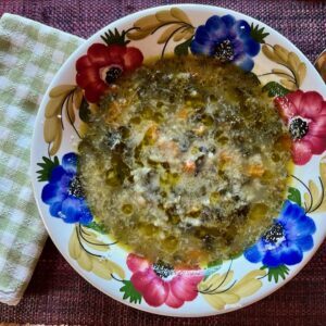 Ingredients1/3 cup extra virgin olive oil1 onion, chopped1 carrot, chopped1 teaspoon salt1 pinch red pepper flakes4 cloves of garlic, minced1/4 cup chopped parsley4 fresh sage leaves, finely chopped2 tablespoons tomato paste10 cups chopped greens ,stems removed (I used a mixture of curly kale, cavolo nero and swiss chard)4 cups vegetable broth3 cups cooked rice or other grainParmigiano for servingInstructionsPour the olive oil in a pot big enough to hold all the soup. Heat gently and add the onions, carrots, salt, red pepper. Let cook gently until softened, about 10 minutes.Add the garlic and herbs and let cook another 2 minutes.Add the tomato paste and cook another few minutes, stirring to let it dissolve.Add the chopped kale first, stirring it to let it wilt a bit. You can add a bit of water if you’d like and cover it for 5 minutes.Then add the chard, stir and add the broth.Cover and cook for about 45 minutes to an hour. Taste and adjust for seasoning. Add the cooked rice, heat through.To serve ladle into bowls and top with a drizzle of your best olive oil, and lots of freshly grated parmigiano or pecorino.The post Green Winter Soup appeared first on Elizabeth Minchilli.