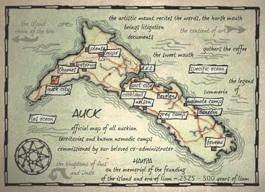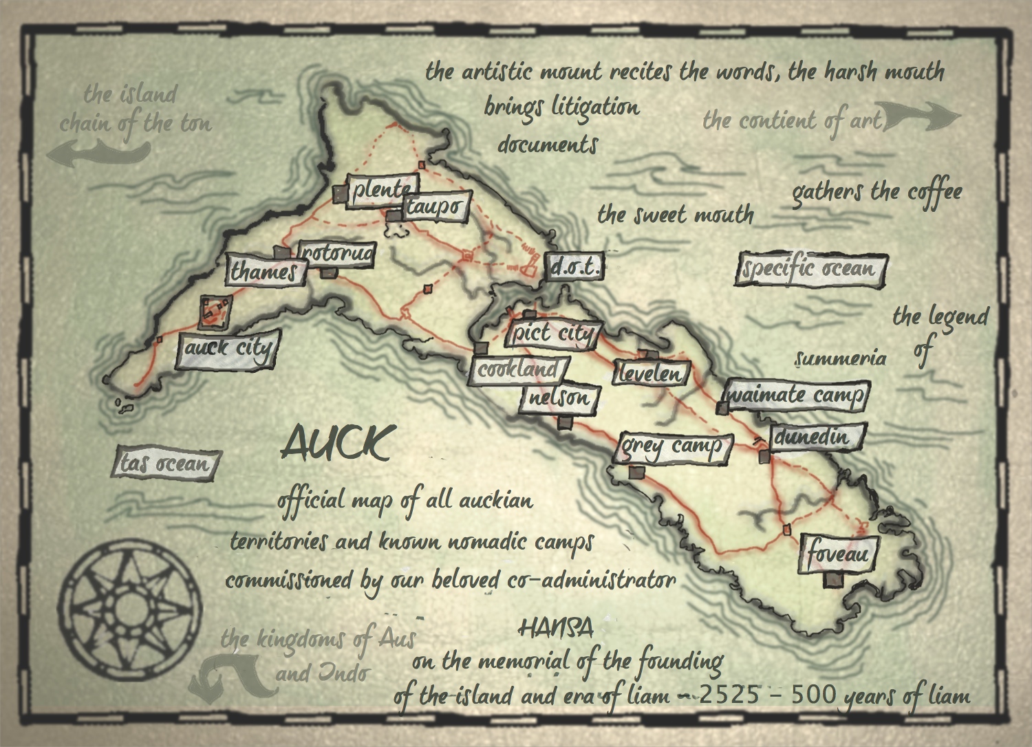 The map is based on the ice age sea levels of New Zealand. It's assuming 500 years have passed after a meteor knocked the planet into a different rotation. Other than that, it's pretty easy to see what's happening.