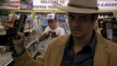 The Glock became my hero's handgun of choice (pictured above from the television show "Justified') because it is the lightest, smallest, and easiest to conceal. It is the most expensive of the three, but it's reputation makes in well-worth the cost. It is solid, and holds about ten rounds with no funky magazine extensions. Another reason is because the hammer remains concealed, minimizing the possibility of cocking it while pulling it from concealment. Most of all, the Glock has a safety in the trigger which makes it easier and quicker to shoot.I can tell you from experience, there is not a more terrible feeling than pulling a weapon in a hurry, only to realize when you try to shoot, that the safety is still engaged. That gives a whole new meaning to the term "The quick and the stupid."