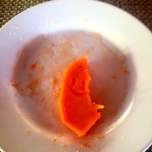 El trozo de papaya me sonrió, inocente. Me lo comí de todos modos. / The papaya piece smiled at me. I ate it anyway.