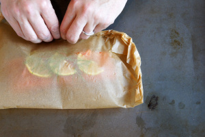 Cooking en papillote (French for "parchment") is a wildly overlooked method of cooking in America. It's an easy method for a quick weeknight dinner that's also elegant enough for guests. The smell that escapes when the package is reason enough to try it. This works well for salmon and mild-flavored white fish such as snapper, cod and so on. The best part? No dishes. Just throw the paper away. To assure thorough cooking, fish fillets or chicken breast slices less than a half-inch thick. This works best in parchment paper, but you can also use aluminum foil. Choose ingredients to get a flavor you like. For instance, to get an Asian flavor, use sesame in place of olive oil, add lime, cilantro and ginger to the package, and possibly finely sliced water chestnuts. Serves two.