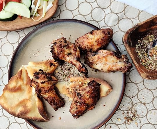 She recommends against barbecuing these and I agree; a hot oven will best mimic the rotisserie flavor. These are best cooked on a large cooking sheet fitted with a cooling rack. If you don’t have one, a broiler pan works fine. Neither? A plain cookie sheet works, just turn them regularly while cooking. I admit, we usually just eat the wings alone, but you can make a meat of them if you serve with some flatbread, a savory grain and sliced onions, tomatoes and cucumber. They reheat fabulously.