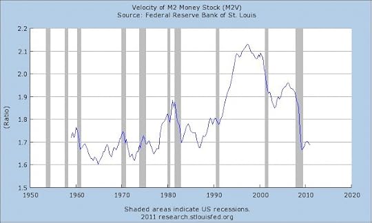 An example more applicable to the current environment is the housing market. The National Association of Realtors reported a 3.8% decline in existing home sales and a 4.6% drop in home prices on Tuesday. A homeowner who cannot sell his house, either because he is underwater on his mortgage or simply can’t find buyers for a price he wants to sell at, has capital that is stationary. He is therefore unlikely to buy someone else’s house, much less spend additional money on items and services often associated with a home purchase. Thus, the capital tied up in the homeowner’s current house is not circulated back into the economy, thereby slowing velocity.