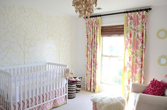 The walls and furniture all are crisp, cool white. The trim and bedding is a soft, rosy pink, feminine but nothing reminiscent of Barbie. The details, like the cushions on the rocking chair, the drawer pulls, the pad on the changing table, and the curtains are a dusty yellow-green.