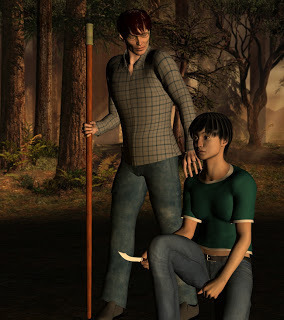 Graveyard 2 by Keryl RaistBetter. The ground still has some odd shadowing, but the background lighting now clearly says, "Sunset." Chris looks a bit less stiff, but I've got the camera so you can't really see his face anymore. His clothing looks better, but still isn't perfect. Sarah looks like she's about to burst into tears, and that's just not right. She's supposed to be scared, not sad. Amazing what a 15% change in the curve of the lips will do. Her hair no longer has those weird lines, but the reflection is a bit too sharp.