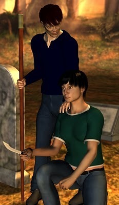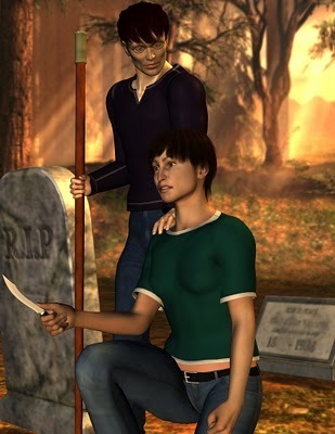 Graveyard 2 by Keryl RaistBetter. The ground still has some odd shadowing, but the background lighting now clearly says, "Sunset." Chris looks a bit less stiff, but I've got the camera so you can't really see his face anymore. His clothing looks better, but still isn't perfect. Sarah looks like she's about to burst into tears, and that's just not right. She's supposed to be scared, not sad. Amazing what a 15% change in the curve of the lips will do. Her hair no longer has those weird lines, but the reflection is a bit too sharp.The big issue right now is posture. Sarah's shoulders are doing a better job of conveying 'scared' but her arms are wrong, and in real life, the knife would fall to the ground if she was holding it that loosely.