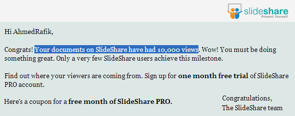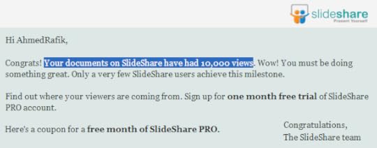 I just received this message from Slide Share team, congratulate me that our presentations reach now 10,000 views on slideshare website. They also give me a free coupon for upgrade my account to PRO Account.Hope you all benefit from these presentations, and thank for your continuous feedback.