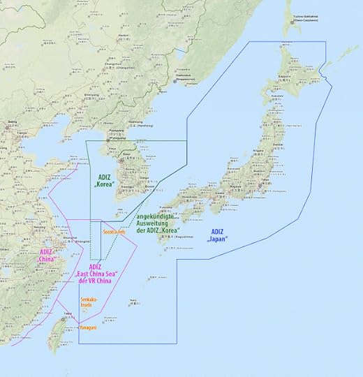 The twenty-first century, however, seemed prepared to accept another Asian nation in the front ranks of nations. But the rivalry has deep historical roots. Current arguments over whether or not holocaust-like atrocities were committed and who is to be master of a handful of rocky islands date only to the end of the late nineteenth centuries. Apropos the latter question, I found the following map which also appears in The Ninja and the Diplomat (to be released in a week or two). It is by Maximilian Dörrbecker (Chumwa) [CC BY-SA 2.0 (http://creativecommons.org/licenses/b...)], via Wikimedia Commons, and shows the Air Defense Identification Zone as defined by China (CADIZ), Japan (JADIZ), and Korea (KADIZ). The islands in dispute, called Senkaku by the Japanese and Diaoyu by the Chinese, are located very close to the northeast of Taipeh.