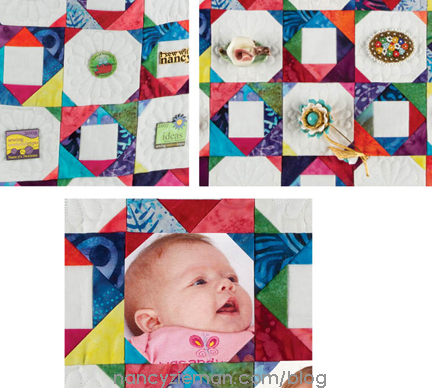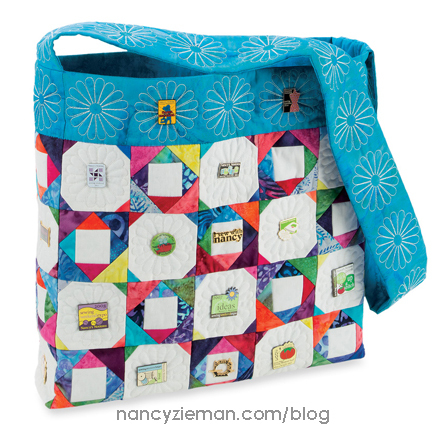 The blocks, Snowball and Square-in-a-Square, are combined to show off your favorite collectible pins, buttons, photos printed on fabric, embroideries, appliqués, fabric prints, and more with this attention-grabbing tote. You’ll be able to fussy-cut fabrics or even feature a special photograph with this design.