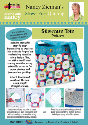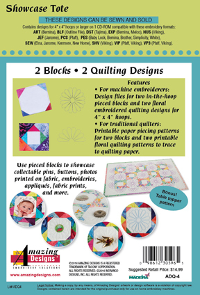 bundle from Amazing Designs includes pieced blocks and a computer-guided embroidery machine quilted design, in addition to the fun bag pattern, bonus table topper pattern, and optional foundation paper-piecing templates. Talk about bang for your buck! .