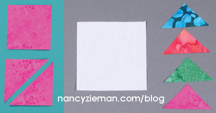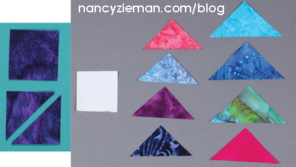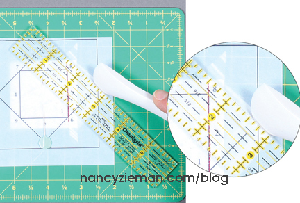 There are several ways to make triangles; my preference is to use the No-Hassle Triangles Gauge. Reference the left side of the gauge for 1/2-square triangles and the right side for 1/4-square triangles.