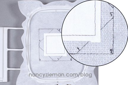 Stitch thread Color 1, the numbered stitching sequence of the block design, directly onto the stabilizer.