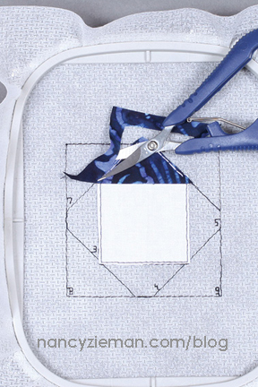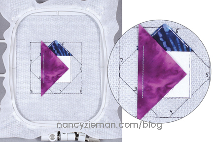 Place Section 1 fabric square over the Section 1 stitched on the stabilizer base, right side up. Fabric must cover the stitched lines.