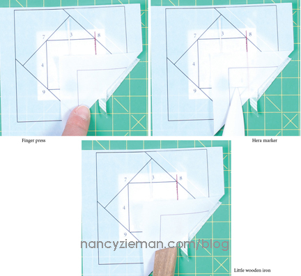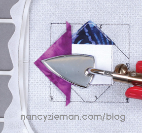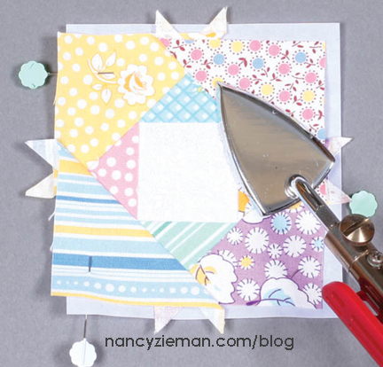 Remove pin and press fabric triangle over Section 2 of the paper foundation using a mini iron , Little Wooden Iron, or Hera Marker .