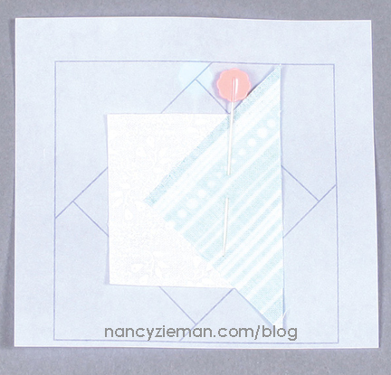 Place Section 2 fabric triangle aligned with the corresponding edge of pinned fabric square, right sides together.