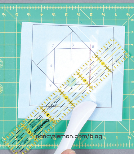 Mark for Section 2 trimming line by placing a gridded quilting ruler on the foundation paper, aligning the ruler’s 1/4″ line on the stitching line.