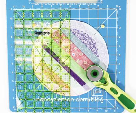 Cut strips the size printed on the gauge. Then cut strips into squares. In this example, cut 6-1/4″ strips, then cut strips into 6-1/4″ squares.