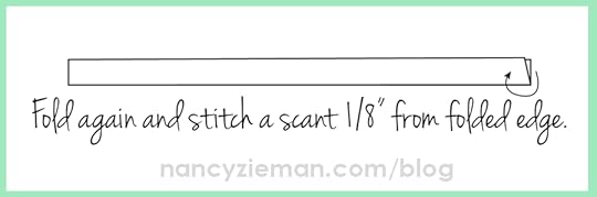 Serge or zigzag stitch the top edge and turn it under 1/2″ and stitch in place.