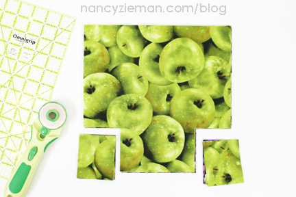 Cut crosswise strips of two fabrics—the size is printed on the No-Hassle Triangles Gauge. Cut strips into squares.