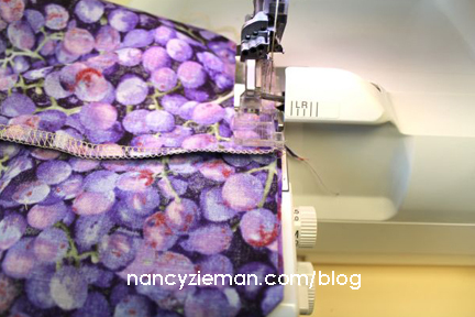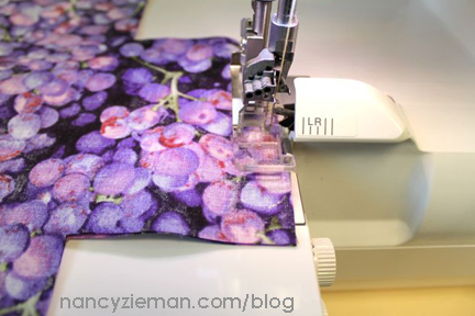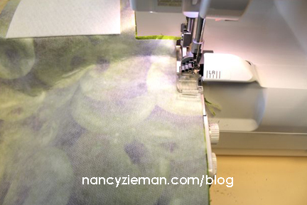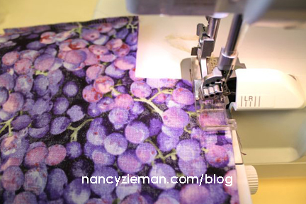 On the bottom edge, turn the serged/overcast edge 1/4″ to the wrong side of the fabric and sew in place.