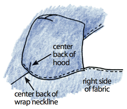 Fit the hood into the curved neck opening, matching the wrong side of the center back edge of the hood to the center right side of the neck opening, and pin the edges together.