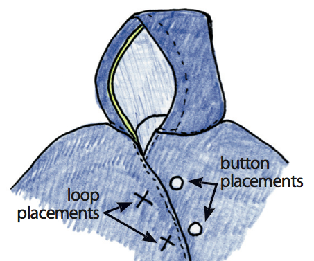 It’s time to try on the wrap to select placements for closures. Though the closures are optional, they help keep the wrap closed on a rainy, windy day.