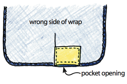 Position the pocket as illustrated and sew the three sides to the wrap back edge.