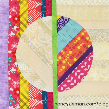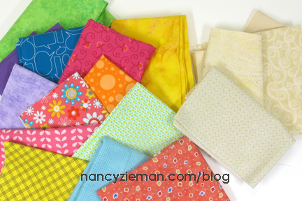 Auditioning fabrics: You’ll learn how to use a print fabric to audition other fabrics to see if they’re compatible. The striped fabric served as the color inspiration for this quilt. All of the “wind chime fabrics” came from my stash.