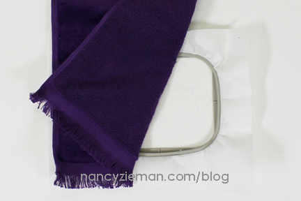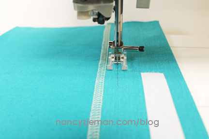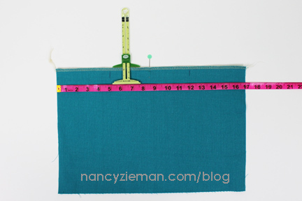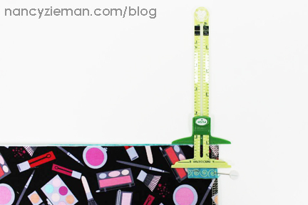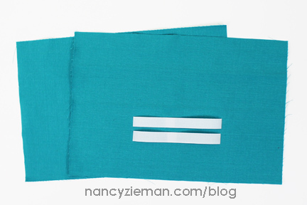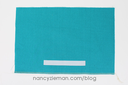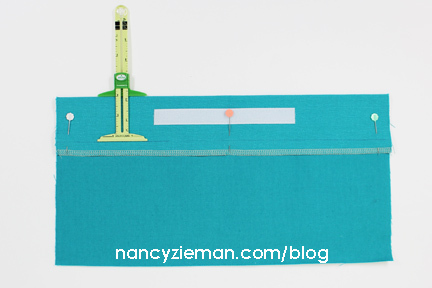 Center the top edge of the hook & loop tape strips to each rectangle 1-1/2″ from the serged or zigzagged edge. Measure using the 5-in-1 Sliding Gauge .