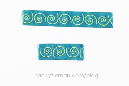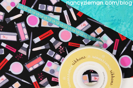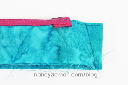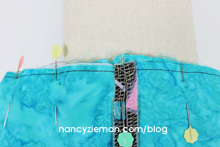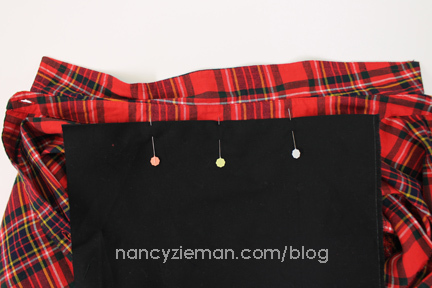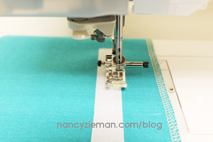 Position the folded ribbon 1″ from the cut edge. Baste ribbon to the outer fabric. Add ribbon to right and left sides.