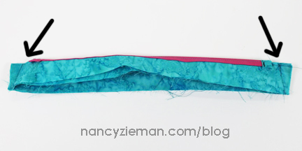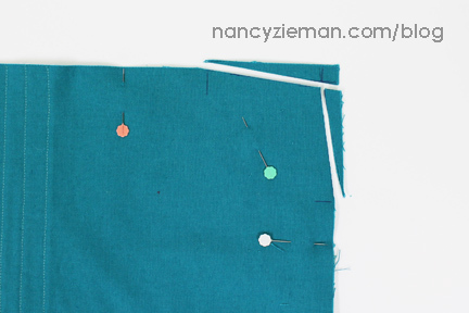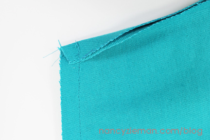 “Wrap” the corners: Fold the fabric along the stitch line at the bottom corner; pin.